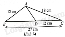 Cho tam giác \(ABC\) có \(AB = 12\)cm, \(AC = 18\)cm, \(BC = 27\)cm. Điểm \(D\) thuộc cạnh \(BC\) sao cho \(CD = 12\)cm. Tính độ dài \(AD\).