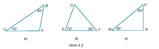 Hãy tính các số đo các góc A, D, N trong các tam giác dưới đây (H.4.3). Trong các tam giác đó, hãy chỉ ra tam giác nào là nhọn, tù, vuông.