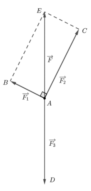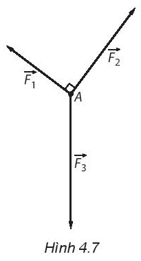 Trên Hình 4.7 biểu diễn ba lực \(\overrightarrow {{F_1}} ,\,\,\overrightarrow {{F_2}} ,\,\,\overrightarrow {{F_3}} \) cùng tác động vào một vật ở vị trí cân bằng \(A.\) Cho biết \(\left| {\overrightarrow {{F_1}} } \right| = 30N,\,\,\left| {\overrightarrow {{F_2}} } \right| = 40N.\) Tính cường độ của lực \(\overrightarrow {{F_3}} .\)