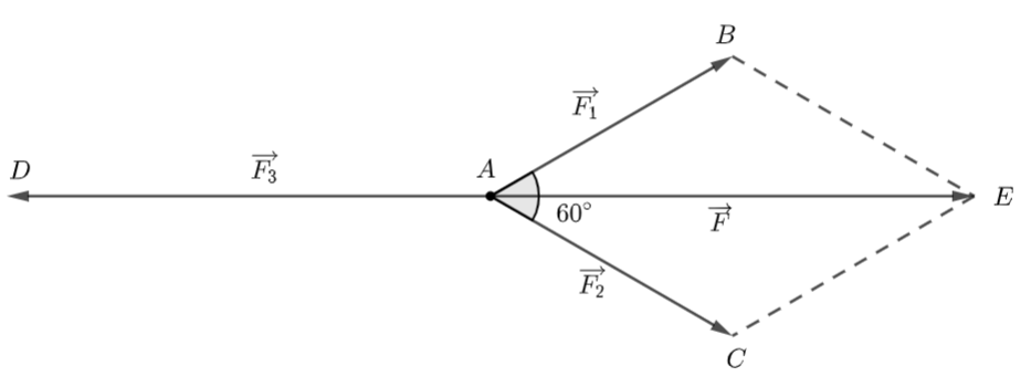 Trên mặt phẳng, chất điểm \(A\) chịu tác động của ba lực \(\overrightarrow {{F_1}} ,\,\,\overrightarrow {{F_2}} ,\,\,\overrightarrow {{F_3}} \) và ở trạng thái cân bằng. Góc giữa hai vectơ \(\overrightarrow {{F_1}} ,\,\,\overrightarrow {{F_2}} \) bằng \({60^ \circ }.\) Tính độ lớn của \(\overrightarrow {{F_3}} ,\) biết rằng \(\left| {\overrightarrow {{F_1}} } \right| = \left| {\overrightarrow {{F_2}} } \right| = 2\sqrt 3 N.\)