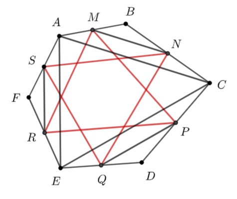 Cho lục giác \(ABCDEF.\) Gọi \(M,\,\,N,\,\,P,\,\,Q,\,\,R,\,\,S\) theo thứ tự là trung điểm của các cạnh \(AB,\;\,BC,\,\,CD,\,\,DE,\,\,EF,\,\,FA.\) Chứng minh rằng hai tam giác \(MPR\) và \(NQS\) có cùng trọng tâm.