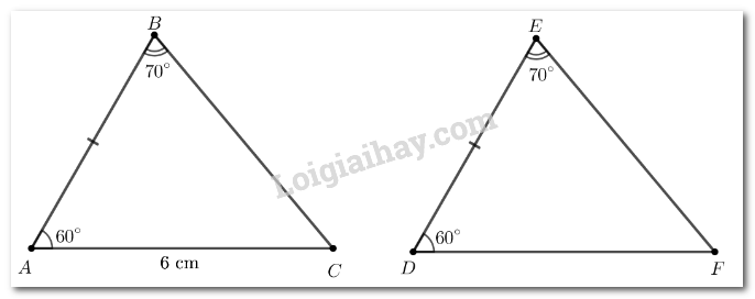Cho hai tam giác ABC và DEF thoả mãn \(AB = DE\), \(\widehat {ABC} = \widehat {DEF} = {70^\circ }\), \(\widehat {BAC} = \widehat {EDF} = {60^\circ }\), \(AC = 6\;{\rm{cm}}.\)