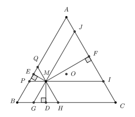 Gọi đường thẳng đi qua \(M\) và song song với \(AB\) cắt \(BC,\,\,AC\) lần lượt tại \(G,\,\,J\); đường thẳng đi qua \(M\) và song song với \(BC\) cắt \(AB,\,\,AC\) lần lượt tại \(P,\,\,I\); đường thẳng đi qua \(M\) và song song với \(AC\) cắt \(AB,\,\,BC\) lần lượt tại \(Q,\,\,H\).