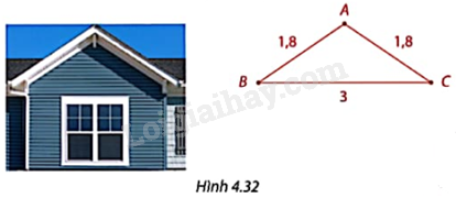 Trong Hình 4.32, mặt tiền mái nhà có chiều rộng \(BC = 3m\) và hai bên mái AB, AC cùng bằng 1,8m.