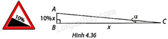 Trong các biển báo dốc nguy hiểm, độ nghiêng của dốc thường được ghi ở dạng phần trăm. Chẳng hạn độ nghiêng 10% nghĩa là dốc có chiều cao AB bằng 10% độ dài BC (Hình 4.36). Dốc 10% có góc nghiêng \(\alpha \) so với phương nằm ngang (làm tròn đến đơn vị độ) là
