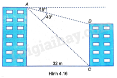 Cho hai tòa nhà cách nhau 32m. Tại điểm A trên nóc tòa nhà cao nhìn xuống nóc D và chân C của tòa nhà thấp lần lượt theo các góc \({15^o}\) và \({43^o}\) (so với phương nằm ngang) (H.4.16). Tính chiều cao của hai tòa nhà đó (làm tròn đến m).