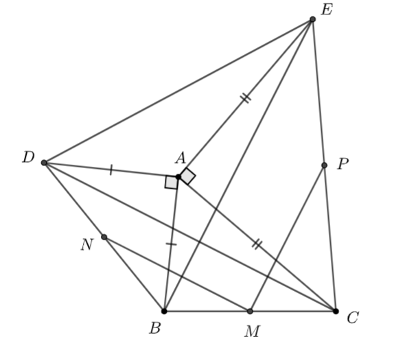 Cho tam giác \(ABC\) có \(\widehat A < {90^ \circ }.\) Dựng ra phía ngoài tam giác hai tam giác vuông cân đỉnh \(A\) là \(ABD\) và \(ACE.\) Gọi \(M,\,\,N,\,\,P\) theo thứ tự là trung điểm \(BC,\,\,BD,\,\,CE.\) Chứng minh rằng: