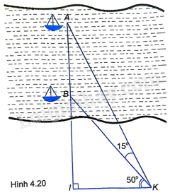 Hai chiếc thuyền A và B ở vị trí được minh họa như trong Hình 4.20. Tính khoảng cách giữa chúng (làm tròn đến m), biết (IK = 380m).