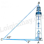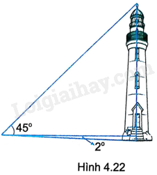 Một người đứng cách chân ngọn hải đăng 50m, nhìn xuống chân hải đăng dưới góc \({2^o}\) và nhìn lên đỉnh ngọn hải đăng dưới góc \({45^o}\) (so với phương nằm ngang) (H.4.22). Tính chiều cao ngọn hải đăng (làm tròn đến mét).