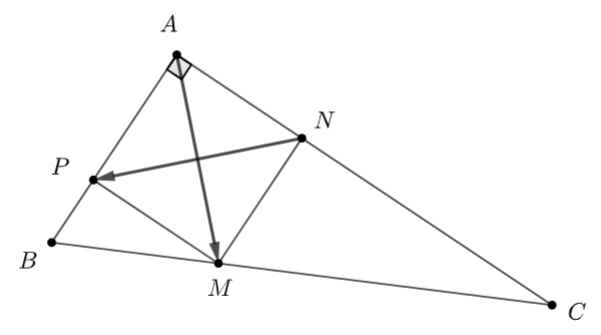 Cho tam giác \(ABC\) vuông tại \(A\) có \(AB = 1,\,\,AC = 2.\) Lấy \(M,\,\,N,\,\,P\) tương ứng thuộc các cạnh \(BC,\,\,CA,\,\,AB\) sao cho \(2BM = MC,\,\,CN = 2NA,\,\,AP = 2PB.\) Giá trị của tích vô hướng \(\overrightarrow {AM} .\overrightarrow {NP} \) bằng