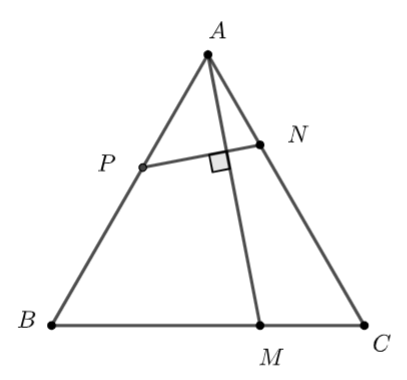 Cho tam giác \(ABC\) đều các cạnh có độ dài bằng 1. Lấy \(M,\,\,N,\,\,P\) lần lượt thuộc các cạnh \(BC,\,\,CA,\,\,AB\) sao cho \(BM = 2MC,\,\,CN = 2NA\) và \(AM \bot NP.\) Tỉ số của \(\frac{{AP}}{{AB}}\) bằng