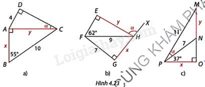Tính độ dài cạnh x, y và số đo góc \(\alpha \) trong mỗi trường hợp ở Hình 4.23.
