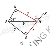 + \(\Delta \)EFH vuông tại E nên \(y = FH.\sin EFH,\widehat {EHF} = {90^o} - \widehat {EFH}\). Do đó, \(\alpha = {180^o} - \widehat {EHF} - \widehat {FHG}\).
