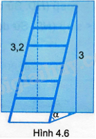 Một cái thang dài 3,2m đặt tựa bức tường, đầu thang đạt đến độ cao 3m thì thang tạo với mặt đất góc \(\alpha \) xấp xỉ bằng bao nhiêu độ (H.4.6)?