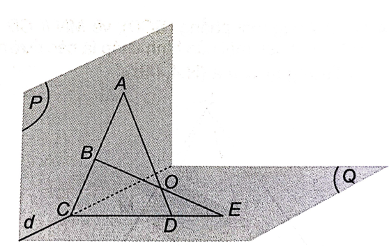 Cho hai mặt phẳng (P) và (Q) cắt nhau theo giao tuyến d và một điểm O nằm ngoài cả hai mặt phẳng đó. Gọi A, B là hai điểm phân biệt thuộc mặt phẳng (P) sao cho AB cắt d tại C. Gọi D, E lần lượt là giao điểm của hai đường thẳng OA, OB và mặt phẳng (Q). Chứng minh rằng ba điểm C, D, E thẳng hàng.