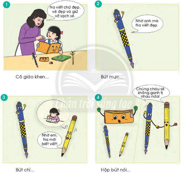 1. Hôm nay bé Na được cô giáo khen. Cô nói Na tiến bộ, tập vở sạch sẽ, hình vẽ cũng rất ngộ nghĩnh. Nghe thế, anh bút mực, bé bút chì vui lắm. Cả hai tranh nhau, ai cũng cho mình có công lớn nhất.