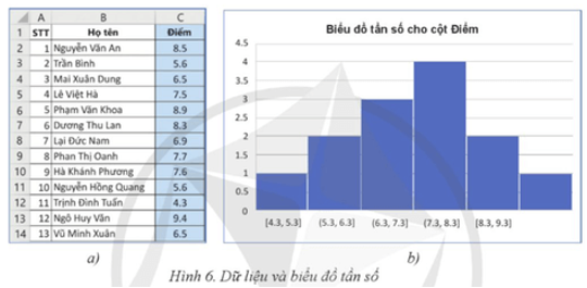 2. Tạo biểu đồ tần số (biểu đồ Histogram) như Hình 6b để trực quan hoá dữ liệu tần số của biến "Điểm" (cột "Điểm" của bảng tính).