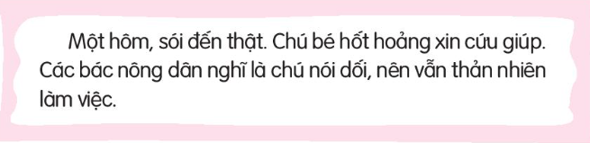 Bài đọc kể về một chú bé chăn cừu hay đùa, giả vờ kêu cứu vì sói tấn công để lừa các bác nông dân. Khi sói thật đến, các bác không tin và đàn cừu bị sói ăn hết. Bài học là không nên nói dối vì sẽ mất đi sự tin tưởng của mọi người. |
