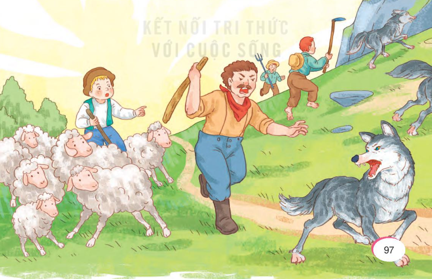 - Tranh 1: Có một chú bé chăn cừu thường thả cừu gần chân núi. Một hôm thấy buồn quá, chú nghĩ ra một trò đùa cho vui. Chú giả vờ kêu toáng lên: “Sói! Sói! Cứu tôi với!”.