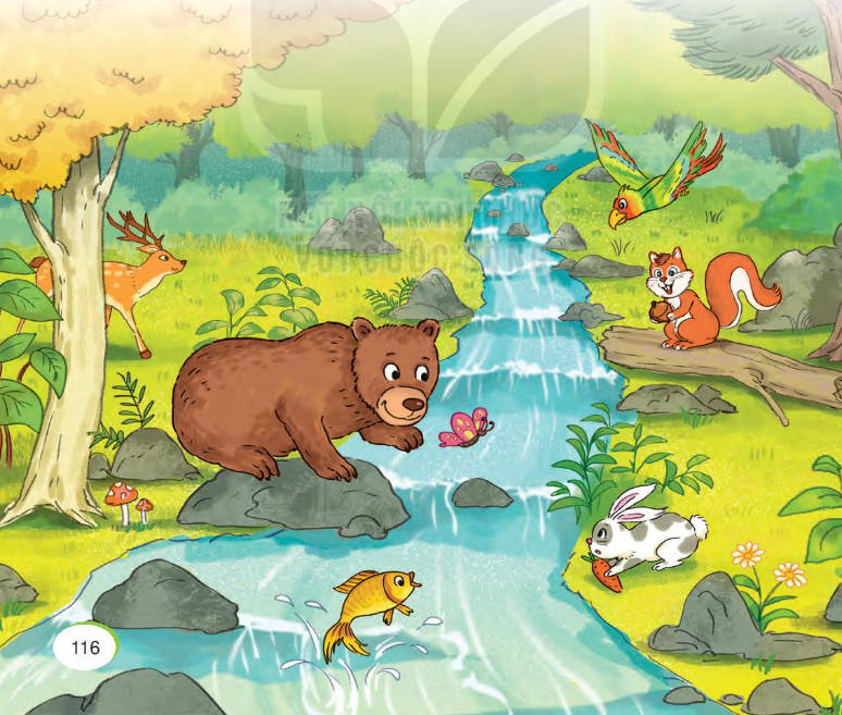 a. Trong tranh có voọc xám, chim gõ kiến, chim yểng, chim công, mèo rừng.