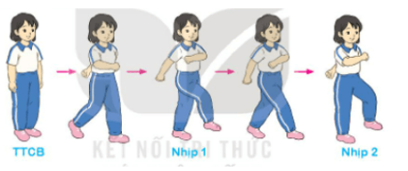 + Nhịp 1: Bước chân trái ra trước khoảng 20 – 30 cm, chạm đất (đúng vào nhịp 1), đồng thời nâng đui phải lên, tay phải đánh thẳng ra sau, tay trái gập trước ngực.