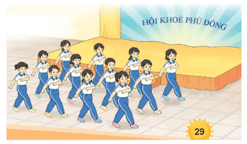 Giải Giáo dục thể chất lớp 3 trang 29 Câu 3: Em cùng các bạn đi đều dự thi môn diễu hành thể thao ở Hội khỏe Phù Đổng