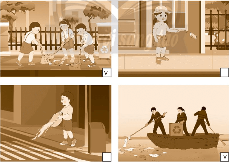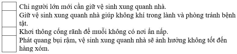 Đánh dấu ✔ vào ô trống ở những hình chỉ việc làm đúng giúp giữ vệ sinh xung quanh nhà ở.