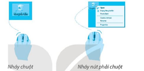 Khởi động máy tính và thực hiện các thao tác với chuột trên màn hình nền: di chuyển chuột, nháy chuột để chọn biểu tượng Recycle Bin, kéo thả chuột để di chuyển biểu tượng Recycle Bin đến vị trí khác, nháy đúp chuột để mở cửa sổ, nháy chuột để đóng cửa sổ.