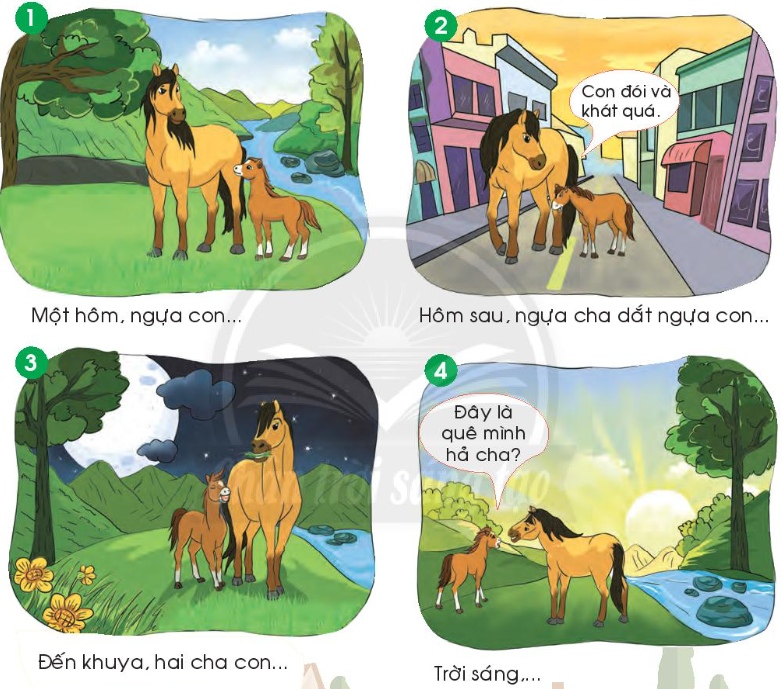 Tranh 1: Một hôm, ngựa con nói với ngựa cha: - Ở đây buồn chán quá, chẳng có gì vui. Con muốn đi nơi khác.