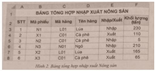 Cho bảng dữ liệu tổng hợp nhập xuất nông sản như Hình 2.