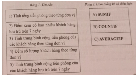Hãy ghép mỗi yêu cầu ở Bảng 1 với một hàm thống kê có điều kiện phù hợp ở Bảng 2.
