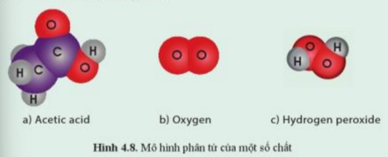 Acetic acid có trong giấm ăn và là chất được sử dụng nhiều trong công nghiệp; oxygen chiếm khoảng 21% thể tích không khí, có vai trò quan trọng đối với sự sống; hydrogen peroxide có nhiều ứng dụng trong công nghiệp và là chất sát khuẩn mạnh. Quan sát hình 4.8, cho biết chất nào là đơn chất, chất nào là hợp chất?