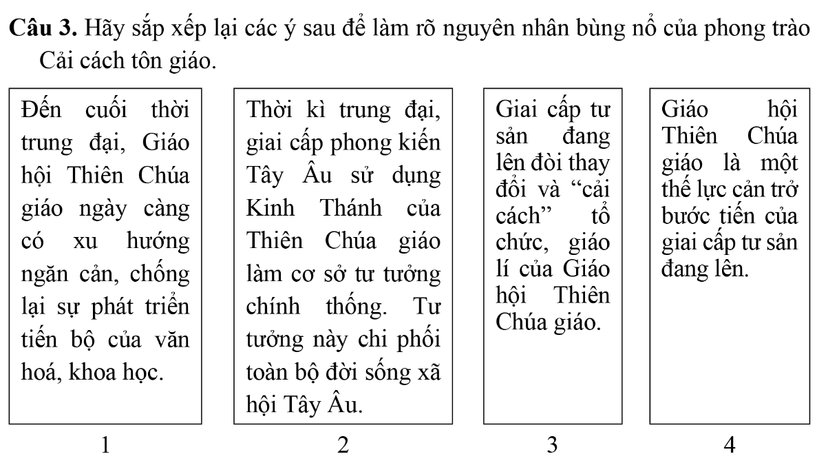 Từ kiến thức đã được học và hiểu biết của bản thân, ta có thể sắp xếp các ý bên trên lần lượt như sau để có thể làm rõ được nguyên nhân bùng nổ của phong trào cải cách tôn giáo: 2 – 1 – 4 – 3