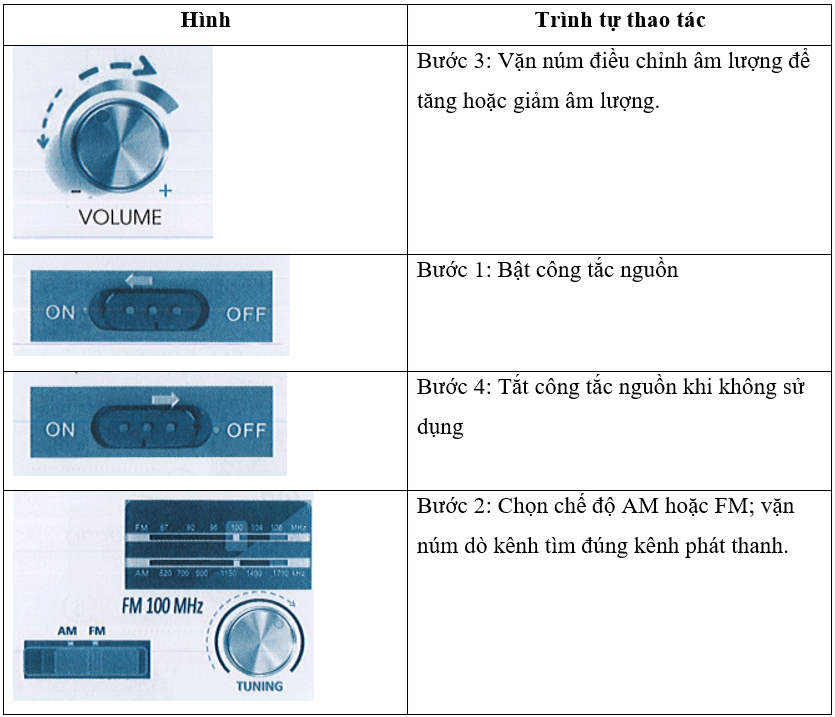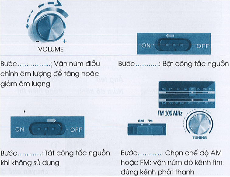 Hãy viết số thứ tự vào chỗ …… trong các hình dưới đây cho đúng trình tự thao tác sử dụng máy thu thanh.