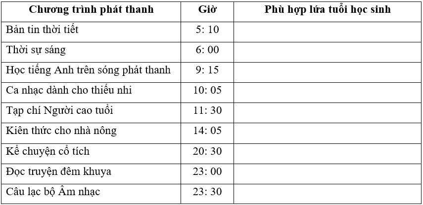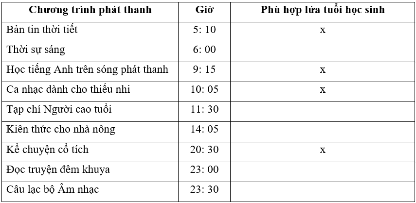 Hãy đánh dấu x vào □ chương trình phát thanh phù hợp với lứa tuổi học sinh trong lịch phát sóng chương trình phát thanh dưới đây.