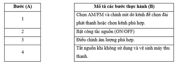 Em hãy nối nội dung mô tả các bước thực hành ở cột B với cột A để sắp xếp đúng thứ tự các bước thực hành sử dụng máy thu thanh.