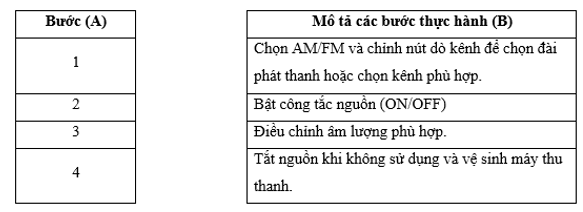 Em hãy nối nội dung mô tả các bước thực hành ở cột B với cột A để sắp xếp đúng thứ tự các bước thực hành sử dụng máy thu thanh.