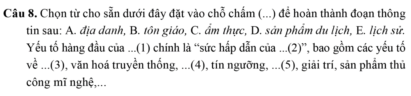 Câu 5. Trong việc phát triển du lịch, yếu tố nào sau đây có vai trò đặc biệt quan trọng?