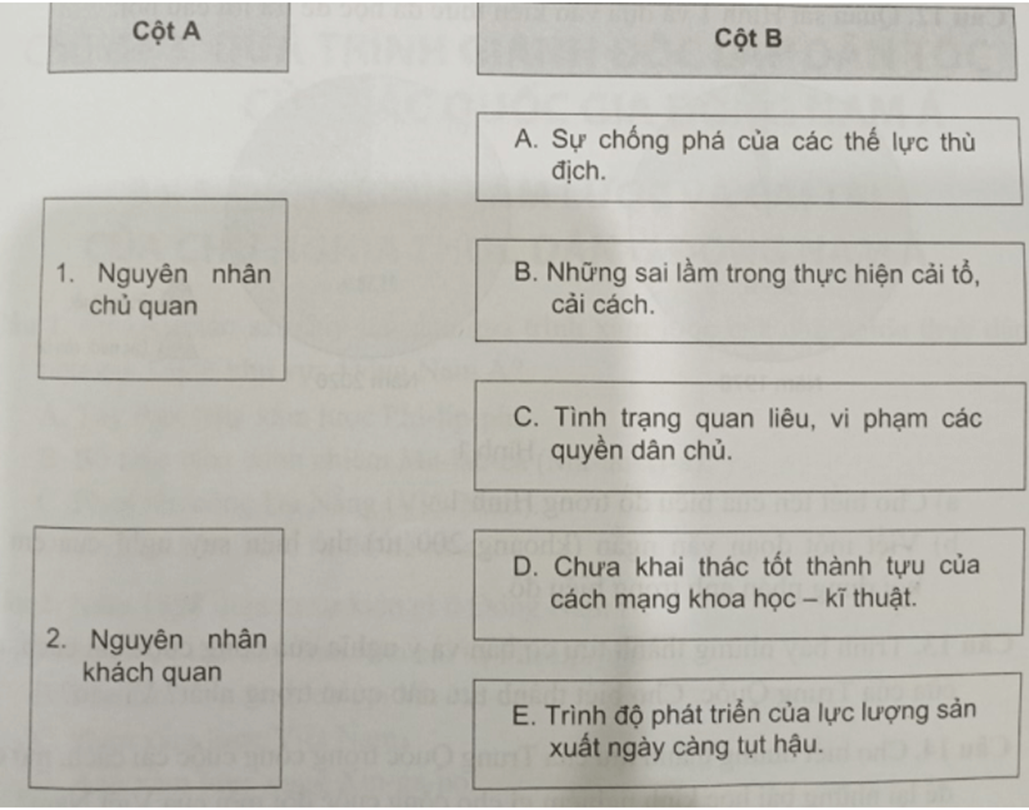 Ghép thông tin ở cột B với nguyên nhân ở cột A để thể hiện nguyên nhân sụp đổ của chủ nghĩa xã hội ở các nước Đông Âu và Liên Xô.