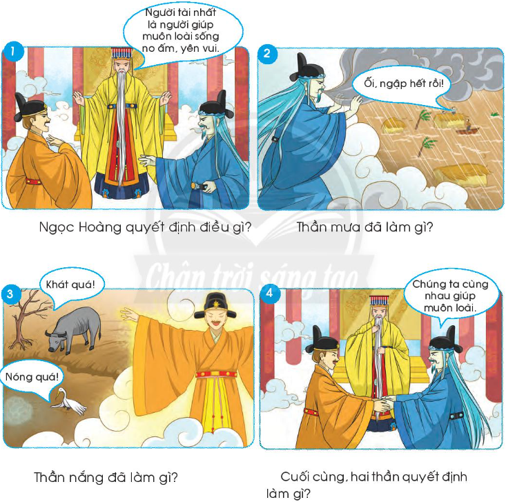 - Tranh 1: Ngọc Hoàng quyết định cho thần mưa và thần nắng so tài, ai giúp cho muôn loài sống no ấm, yên vui thì là người tài nhất.