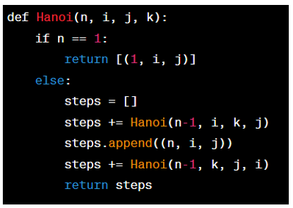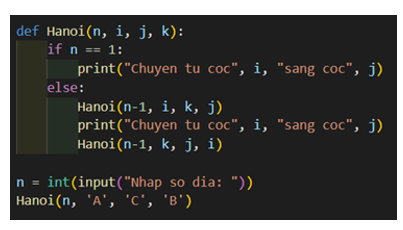 Ví dụ, để chuyển 3 đĩa từ cọc A sang cọc C lấy cọc B làm trung gian, ta có thể gọi hàm Hanoi(3, 'A', 'C', 'B') và kết quả trả về sẽ là danh sách các bước chuyển [(1, 'A', 'C'), (2, 'A', 'B'), (1, 'C', 'B'), (3, 'A', 'C'), (1, 'B', 'A'), (2, 'B', 'C'), (1, 'A', 'C')].