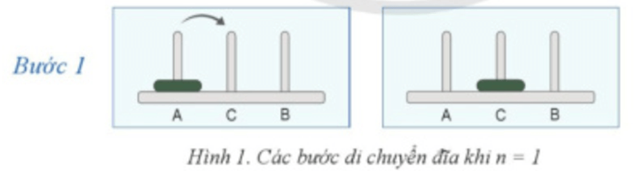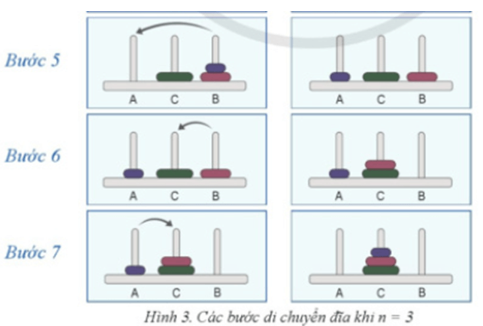 Các Hình 1,2,3 lần lượt minh hoạ các bước di chuyển đĩa cần thực hiện khi số đĩa n = 1,2,3.