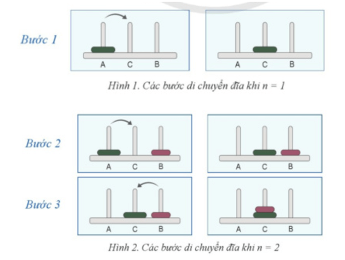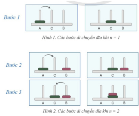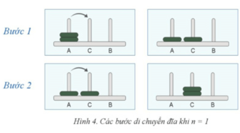 a) Hình 4 và 5 minh hoạ cách di chuyển đĩa với n = 1 và n = 2 tương ứng.