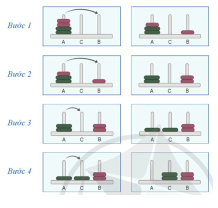 2. Chỉ được xếp đĩa có đường kính nhỏ hơn lên trên đĩa có đường kình lớn hơn. Trong quá trình chuyển được phép dùng cột B làm cọc trung gian.