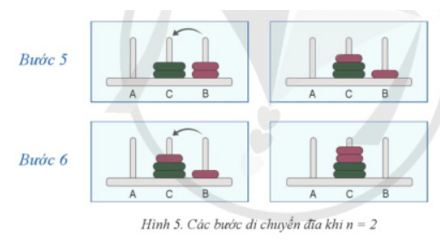 a) Hình 4 và 5 minh hoạ cách di chuyển đĩa với n = 1 và n = 2 tương ứng. Bài toán với n = 2 có 6 bước di chuyển đĩa. em hãy cho biết trong đó có bao nhiêu lần giải bài toán với n = 2. Nêu tên cọc xuất phát và cọc đích ở từng lần giải đó.