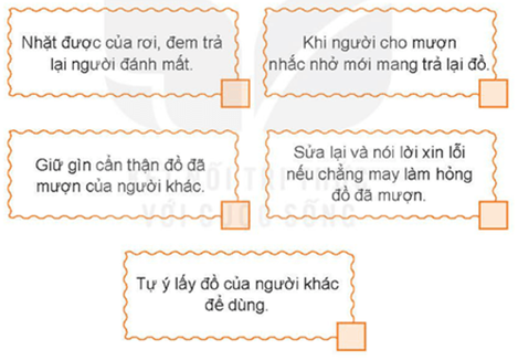 Đánh dấu vào ô trống ở việc làm thể hiện sự tôn trọng tài sản của người khác. Giải thích vì sao em không lựa chọn các việc làm còn lại.