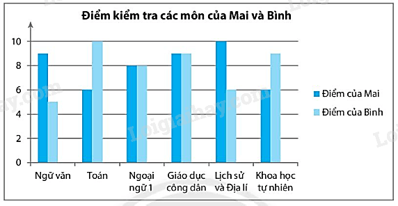 Đọc biểu đồ cột kép biểu diễn điểm kiểm tra các môn của hai bạn Mai và Bình sau đây và nêu nhận xét của em.