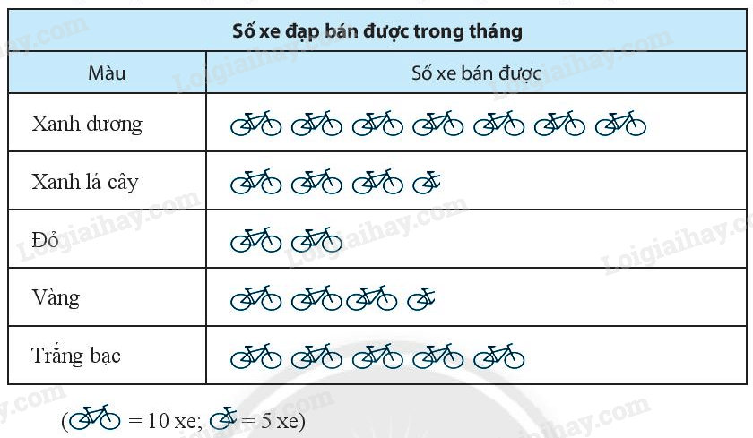 Đọc biểu đồ tranh biểu diễn số xe đạp một cửa hàng đã bán được (theo màu sơn) trong tháng sau đây và ghi dữ liệu vào bảng thống kê tương ứng.