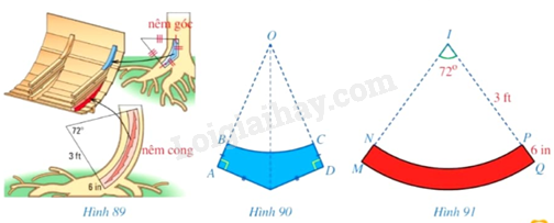 Khi đóng đáy thuyền cho những con thuyền vượt biển, người Vikigns sử dụng hai loại nêm: nêm góc và nêm cong (lần lượt tô màu xanh, màu đỏ trong Hình 89). Mặt cắt (ABCD) của nêm góc có dạng hai tam giác vuông (OAE,ODE) bằng nhau với cạnh huyền chung và bỏ đi hình quạt tròn (OBC)(Hình 90), được làm từ những thân cây mọc thẳng. Mặt cắt (MNPQ) của nêm cong có dạng một phần của hình vành khuyên (Hình 91), được làm từ những thân cây cong. Kích thước của nêm cong được cho như ở Hình 91.