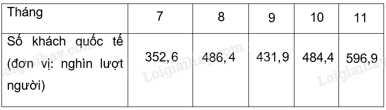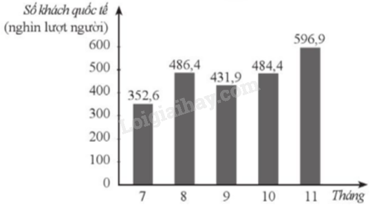 Theo số liệu thống kê số khách quốc tế (đơn vị: nghìn lượt người) đến Việt Nam trong các tháng 7, 8, 9, 10, 11 năm 2023 lần lượt như sau: 352,6; 486,4; 431,9; 484,4; 596,9. (Nguồn: Cục Du lịch Quốc gia Việt Nam). Vẽ biểu đồ cột biểu diễn các số liệu đó.